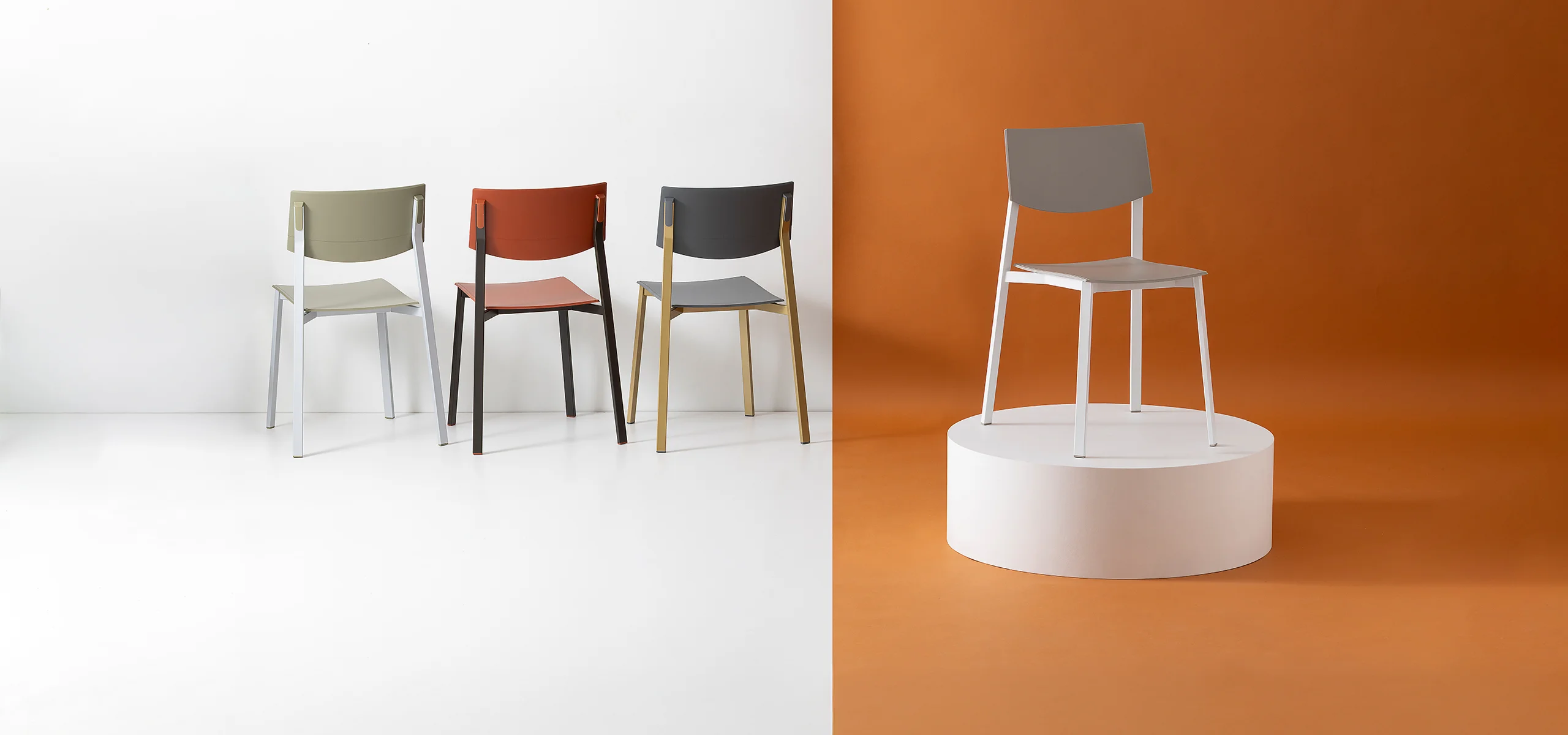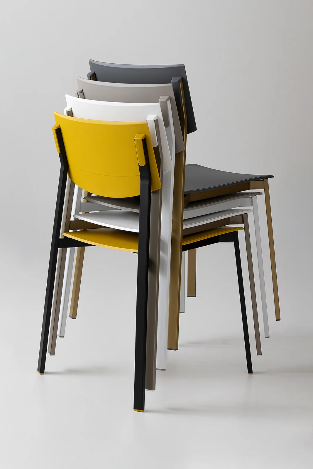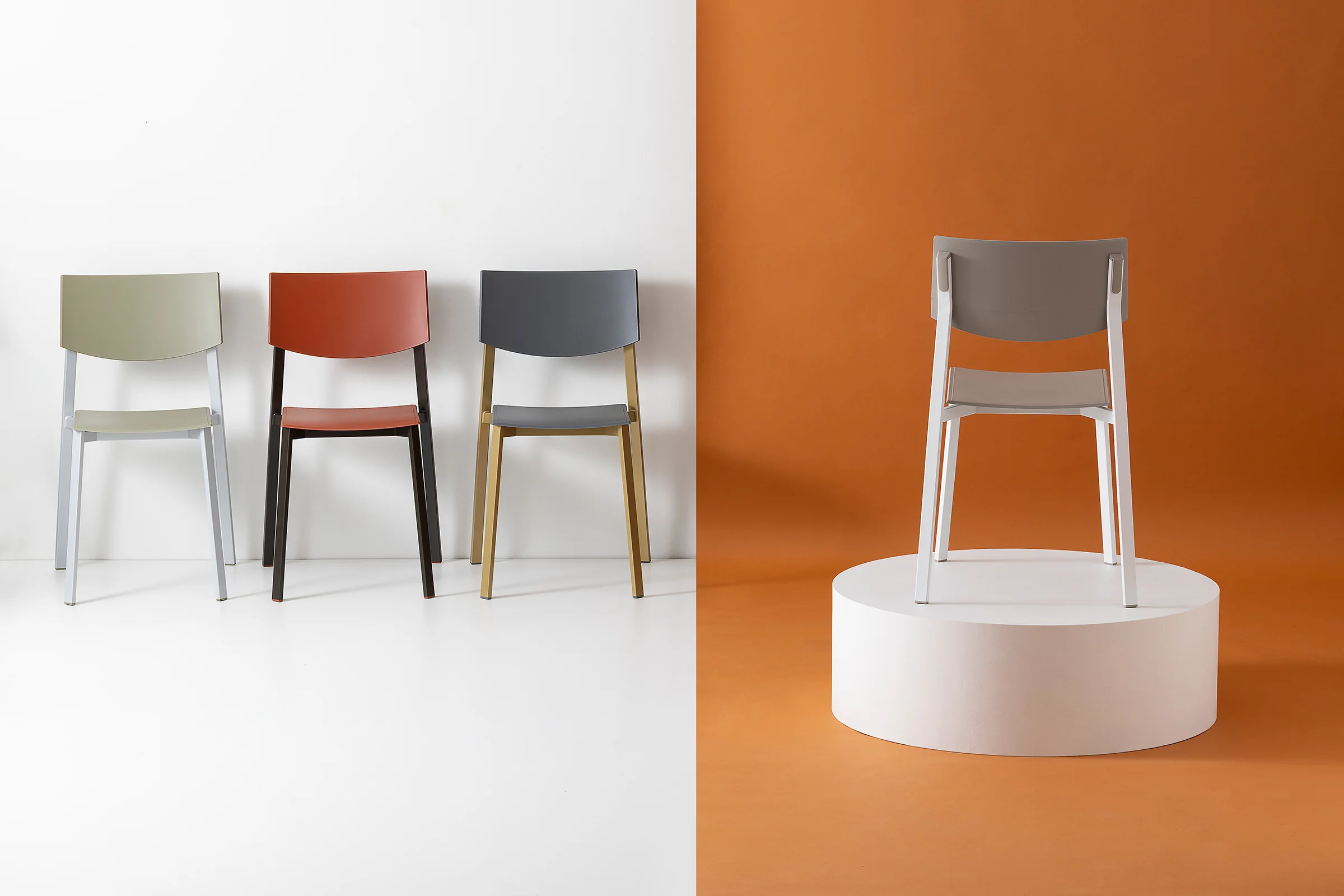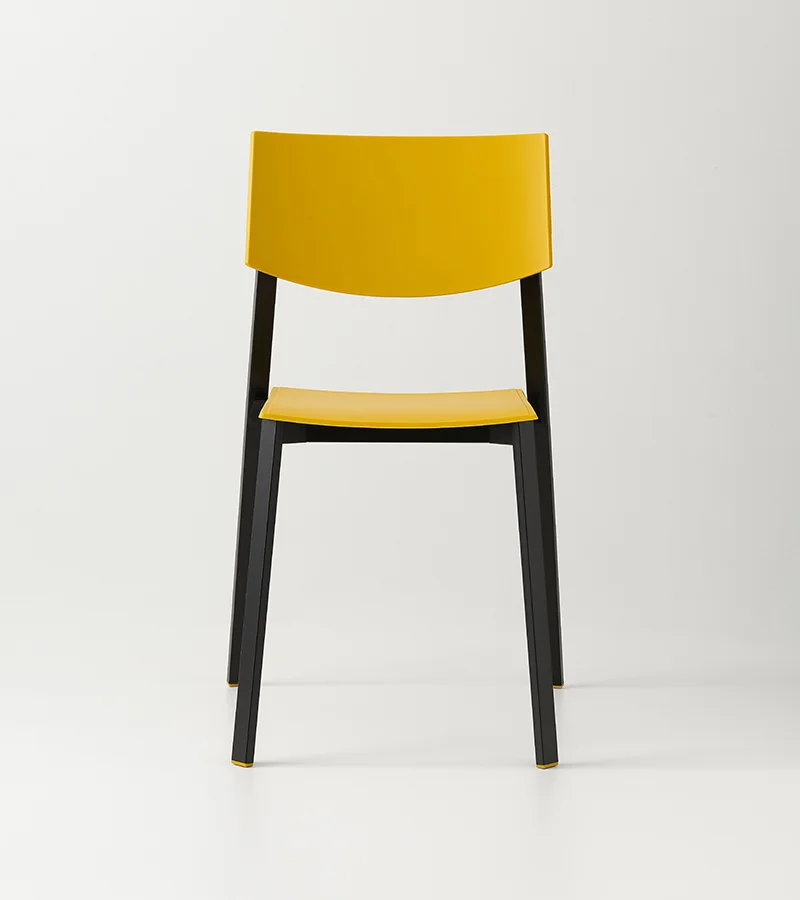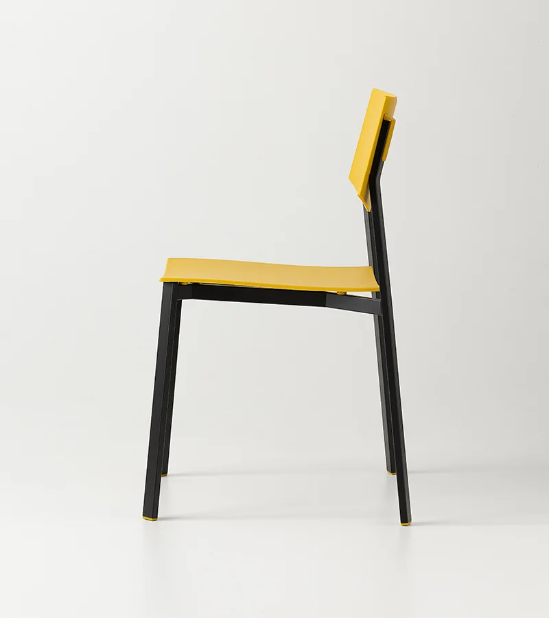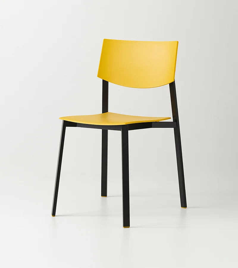 The collection is completed by Beba Young, a chair that focuses on formal purity and intelligent technical details. The rectangular section metal frame incorporates polypropylene caps that conceal the fastening points, while the seat and backrest are made of post-industrial recycled plastic. Lightweight and stackable, it is designed to withstand intensive use without compromising on color. A perfect mix of sustainability and functional design for contemporary spaces.