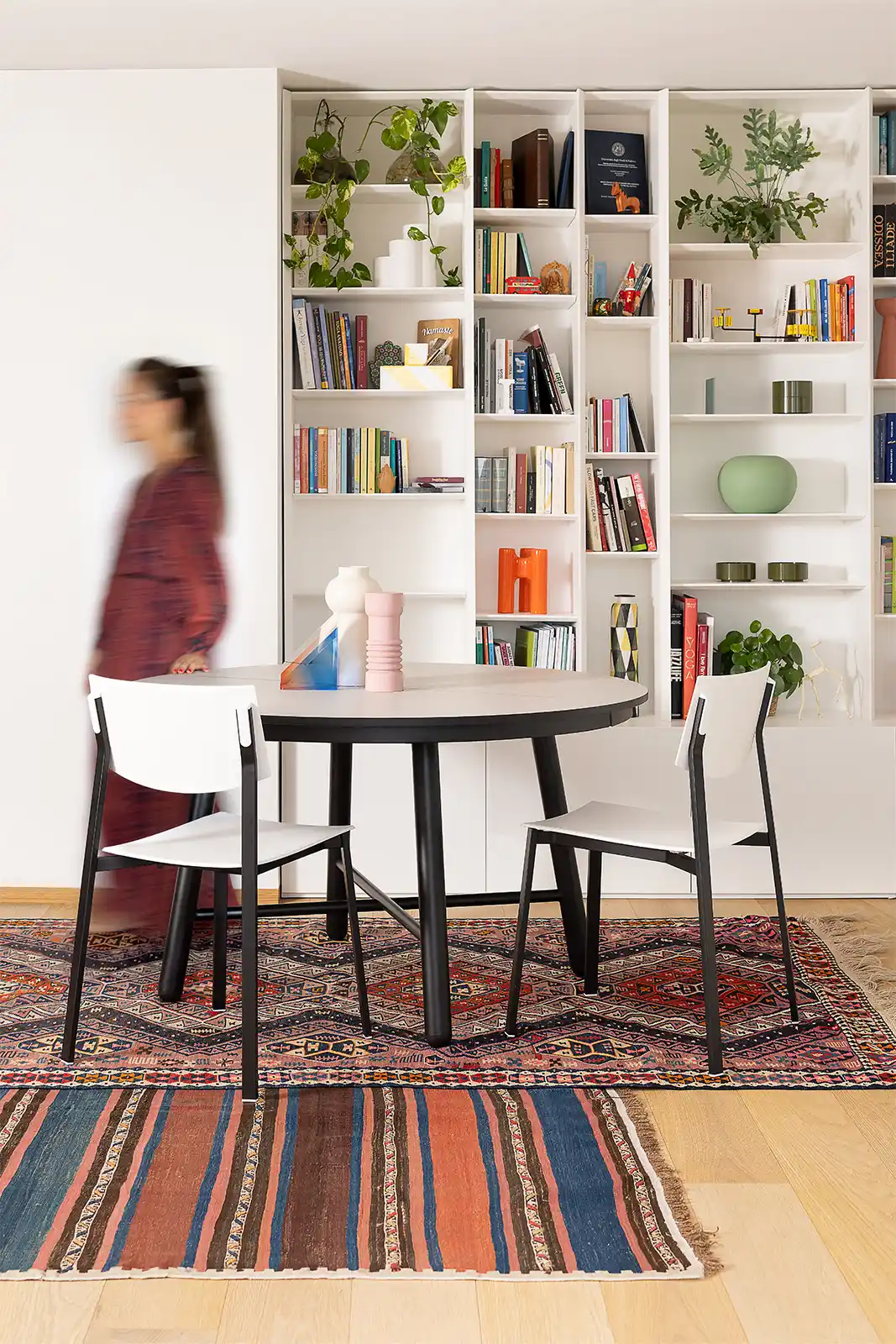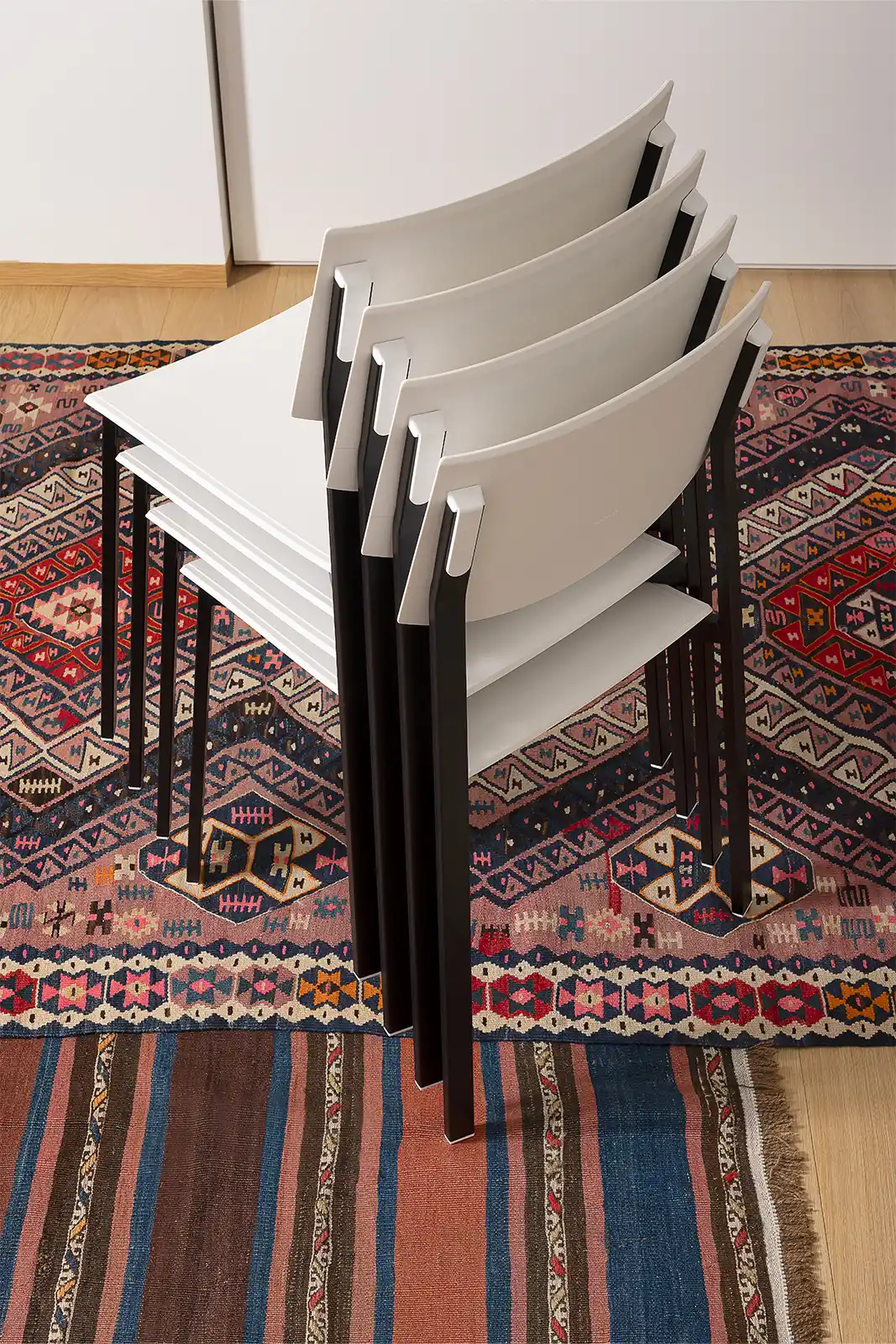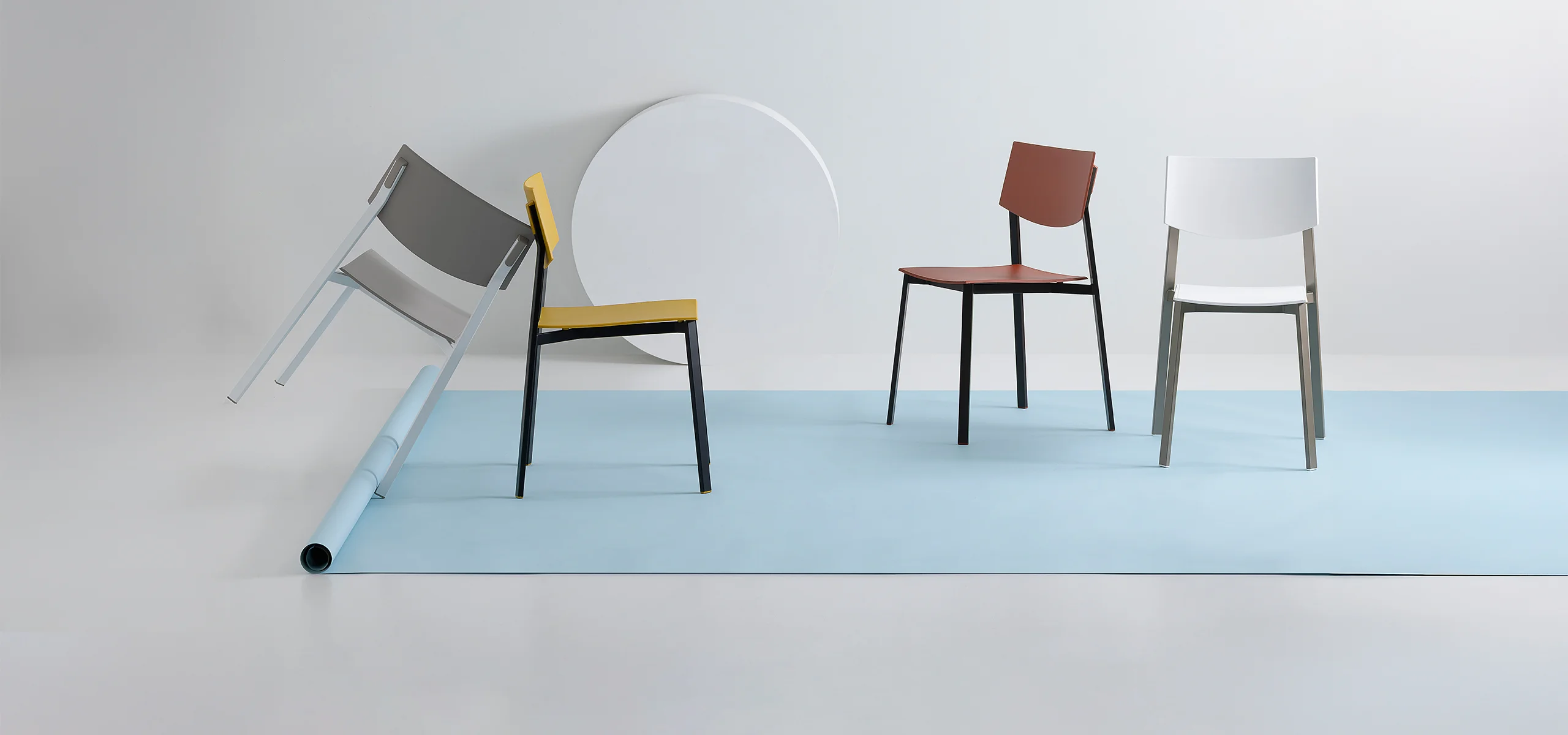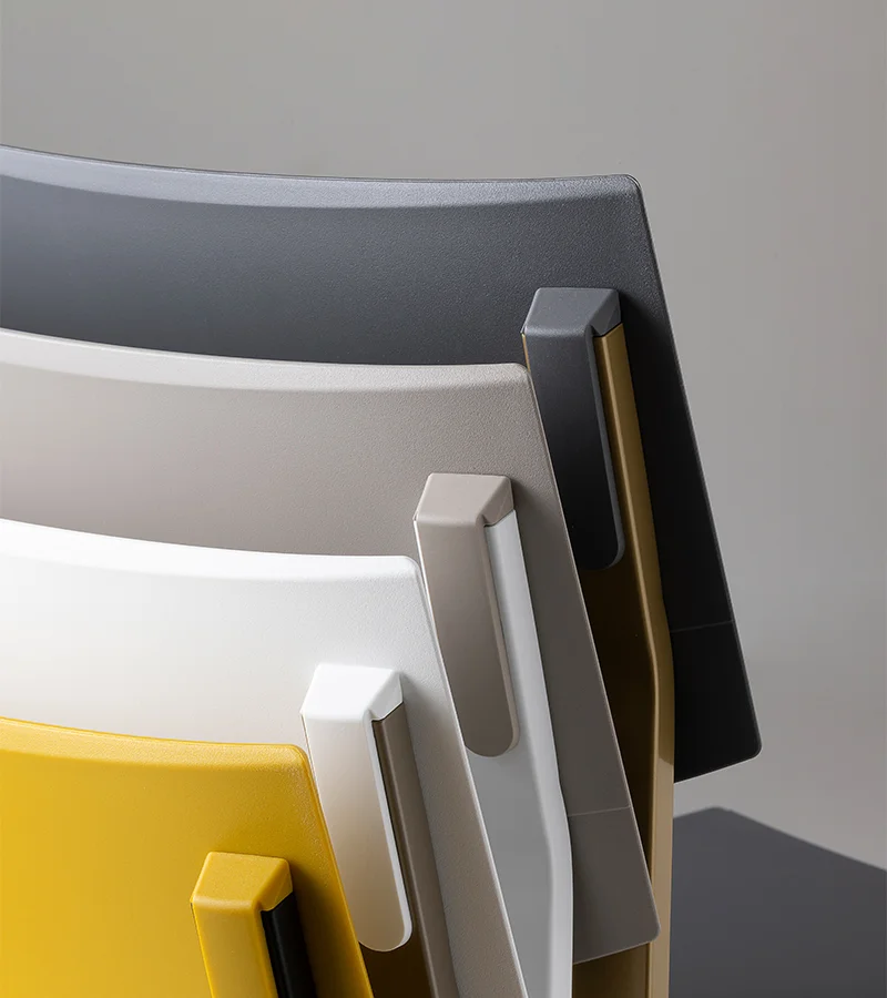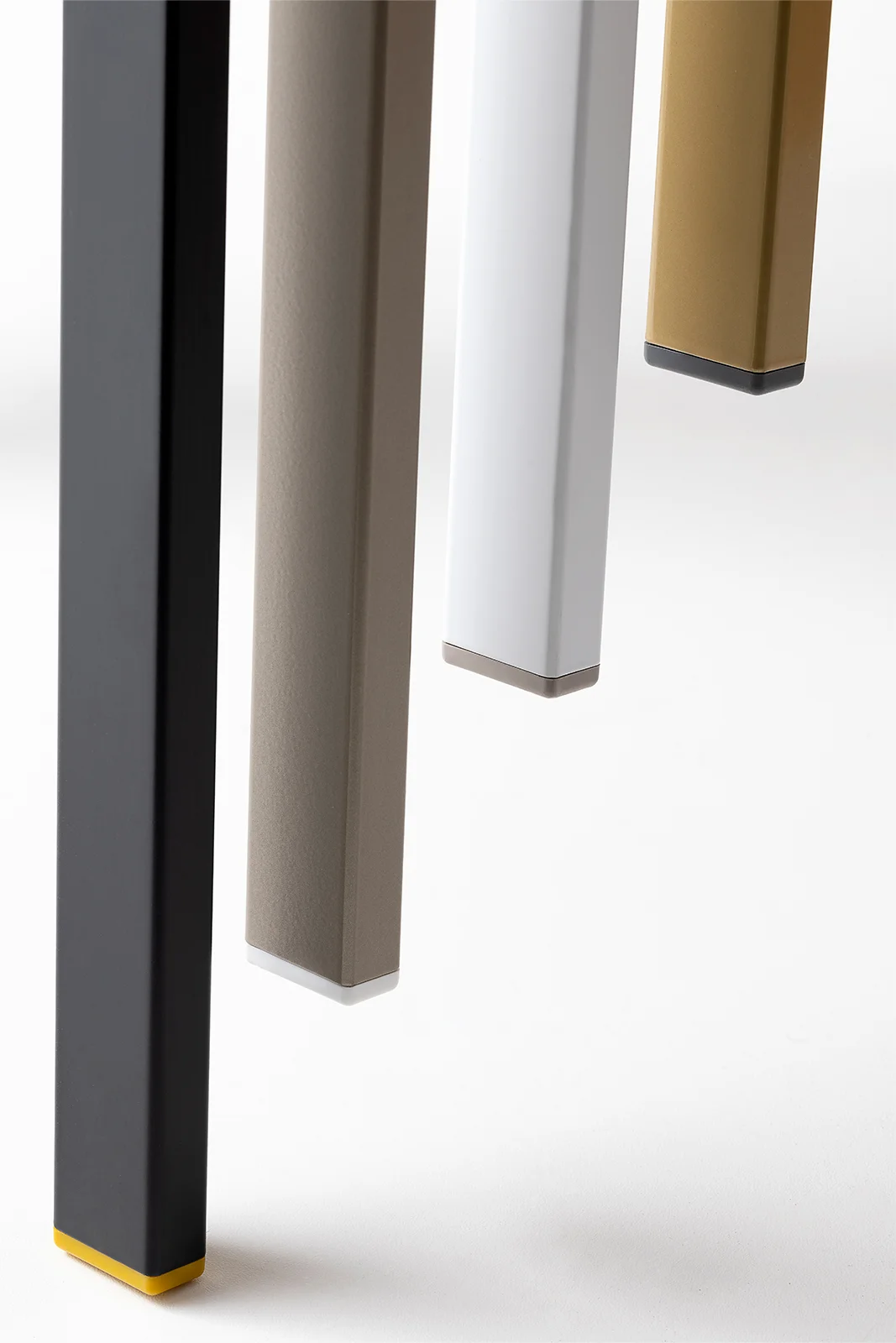 The collection is completed by Beba Young, a chair that focuses on formal purity and intelligent technical details. The rectangular section metal frame incorporates polypropylene caps that conceal the fastening points, while the seat and backrest are made of post-industrial recycled plastic. Lightweight and stackable, it is designed to withstand intensive use without compromising on color. A perfect mix of sustainability and functional design for contemporary spaces.