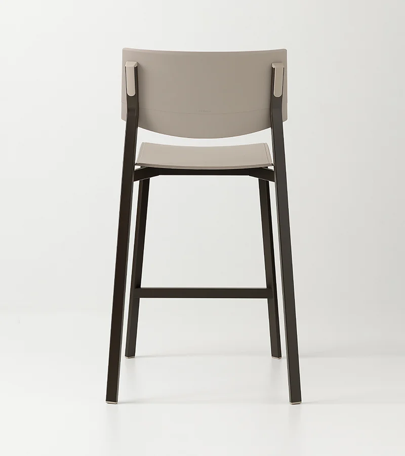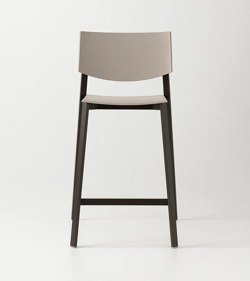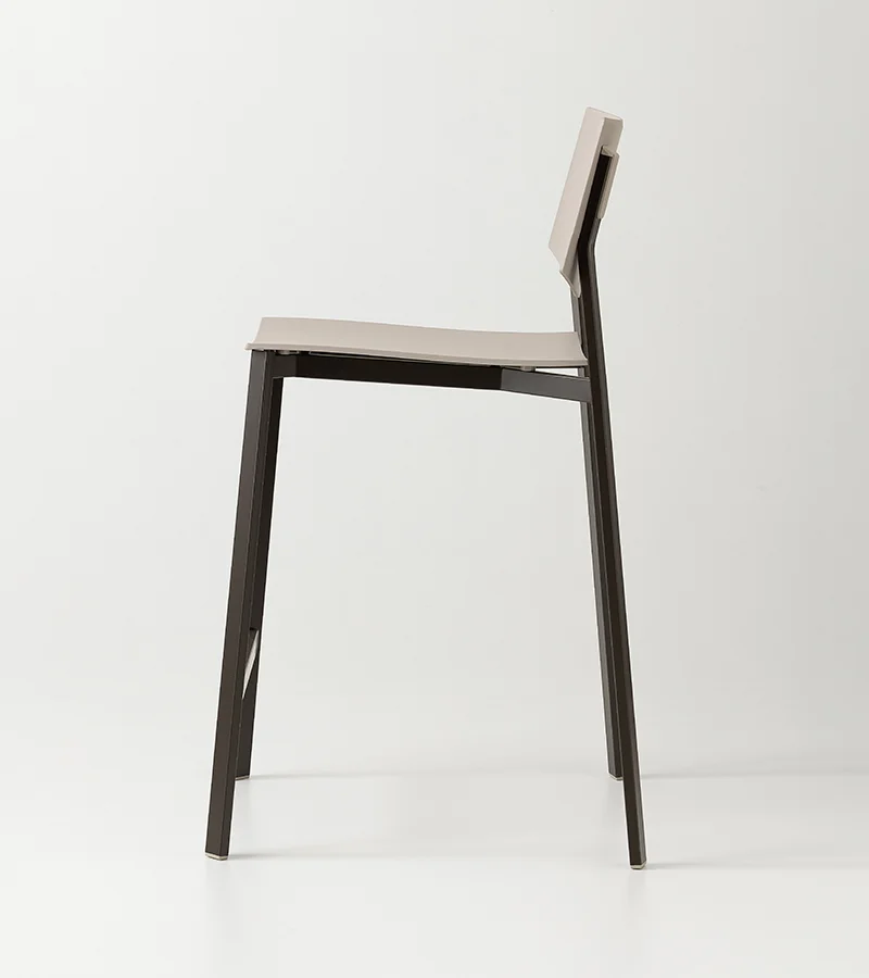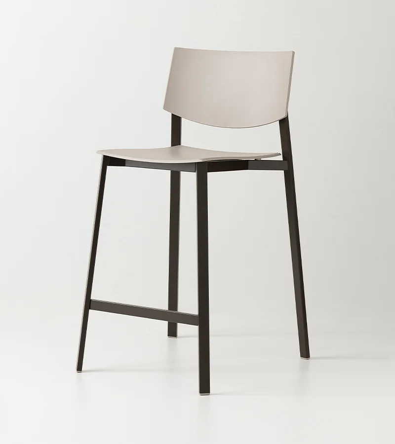 Characterized by a rectangular-section metal frame, the Beba Young stool combines industrial aesthetics with practicality. Matching polypropylene details conceal the backrest joints, offering a fluid and modern design. Made from recycled materials, this model is available in various heights and colors to suit any counter. Its stackable nature and material durability make it ideal for both commercial and domestic settings.