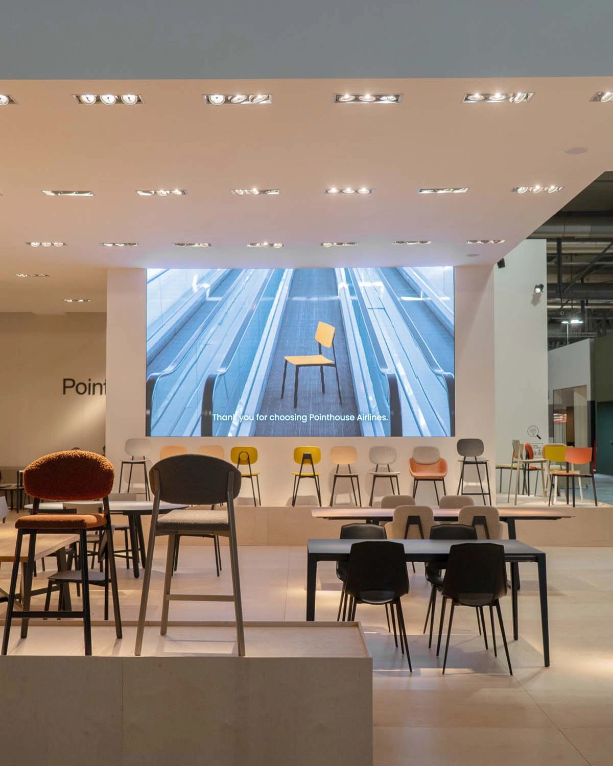 At the heart of the stand, an impressive LED wall captures attention, becoming the focal point of the exhibition. It showcases the visuals from the new campaign, "Pointhouse. Let Your Imagination Take Off". Sustainability is also seamlessly integrated into the airport analogy. Visitors will find a "sustainable materials map" inspired by terminal information boards, illustrating in a clear and intuitive way the origins and characteristics of the materials used in Pointhouse products, highlighting our commitment to a greener future.