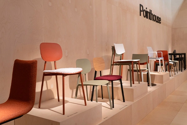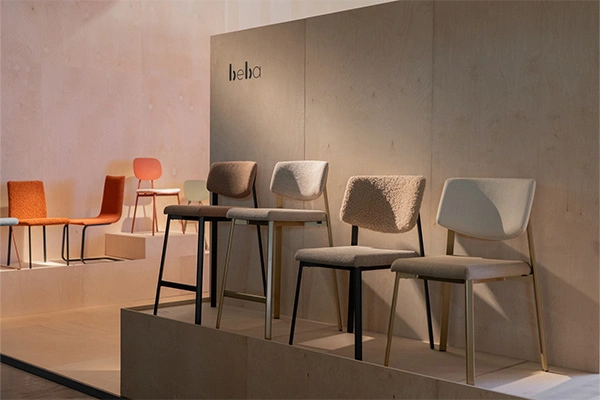 For the design of our exhibition stand, we drew inspiration from our latest project, the Beba collection, which stands out for its lightness and versatility, offering a wide range of chairs and stools. The stand explores the concept of lightness and imagination, linking it to the sense of freedom and possibility one experiences while travelling. In this context, time seems to stretch, and everything becomes possible.