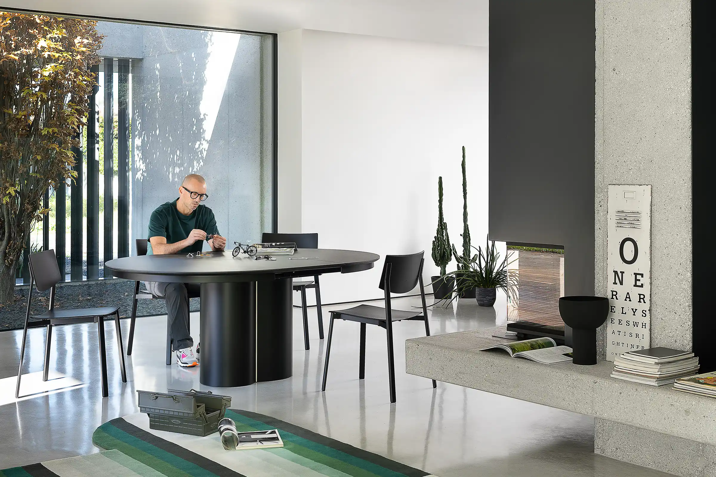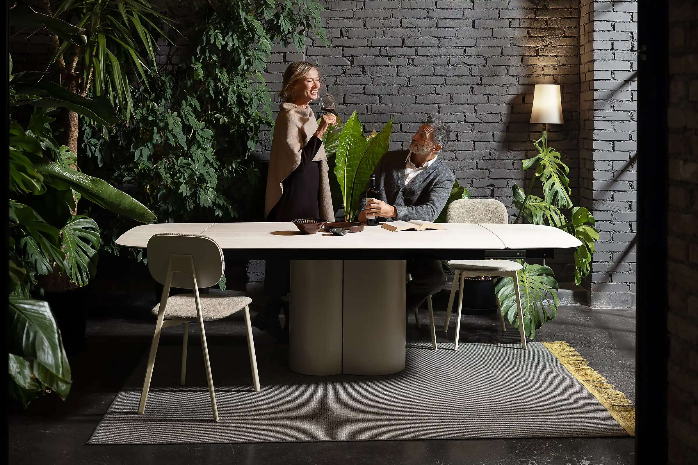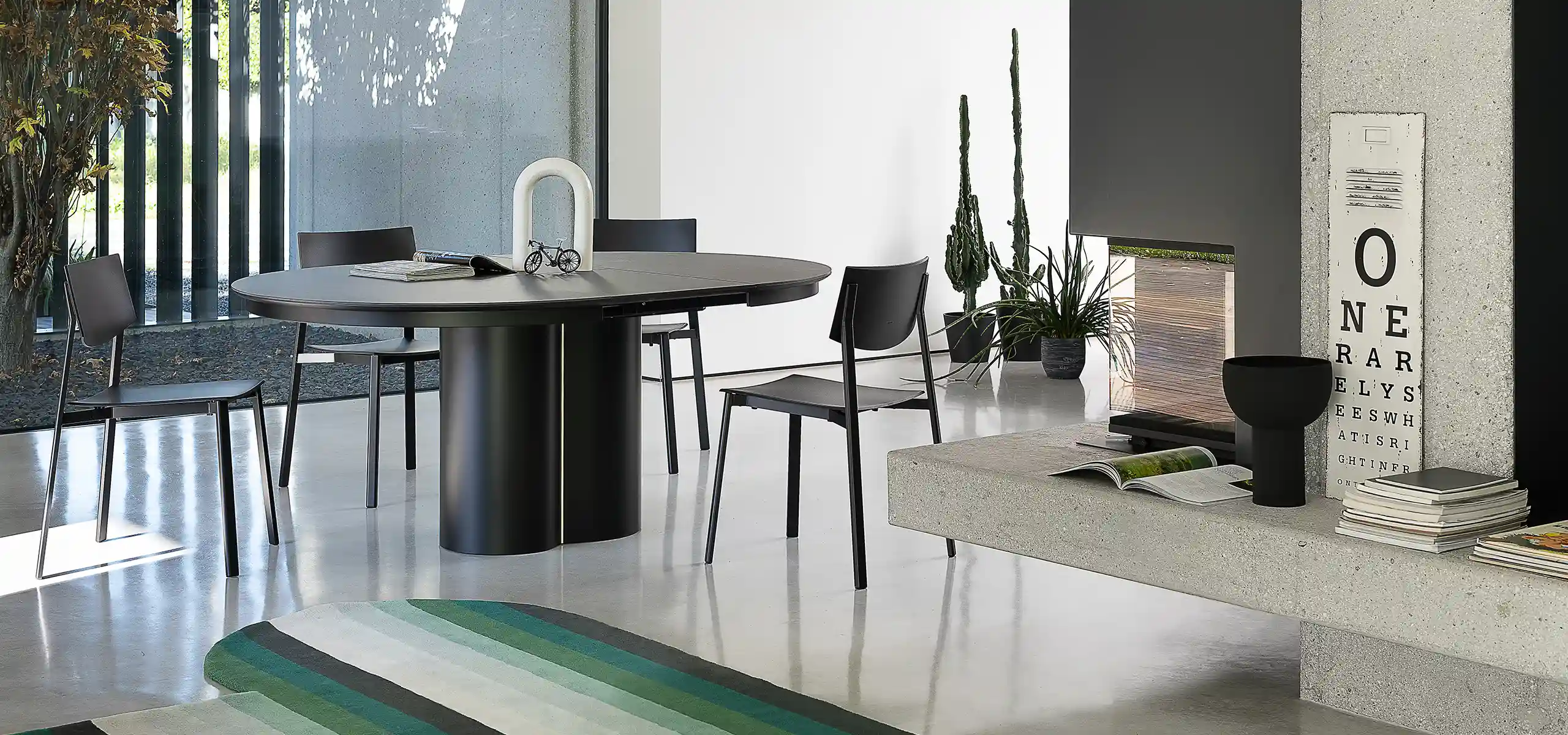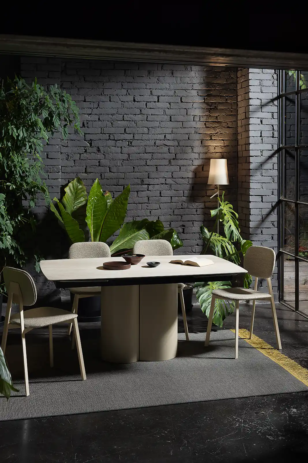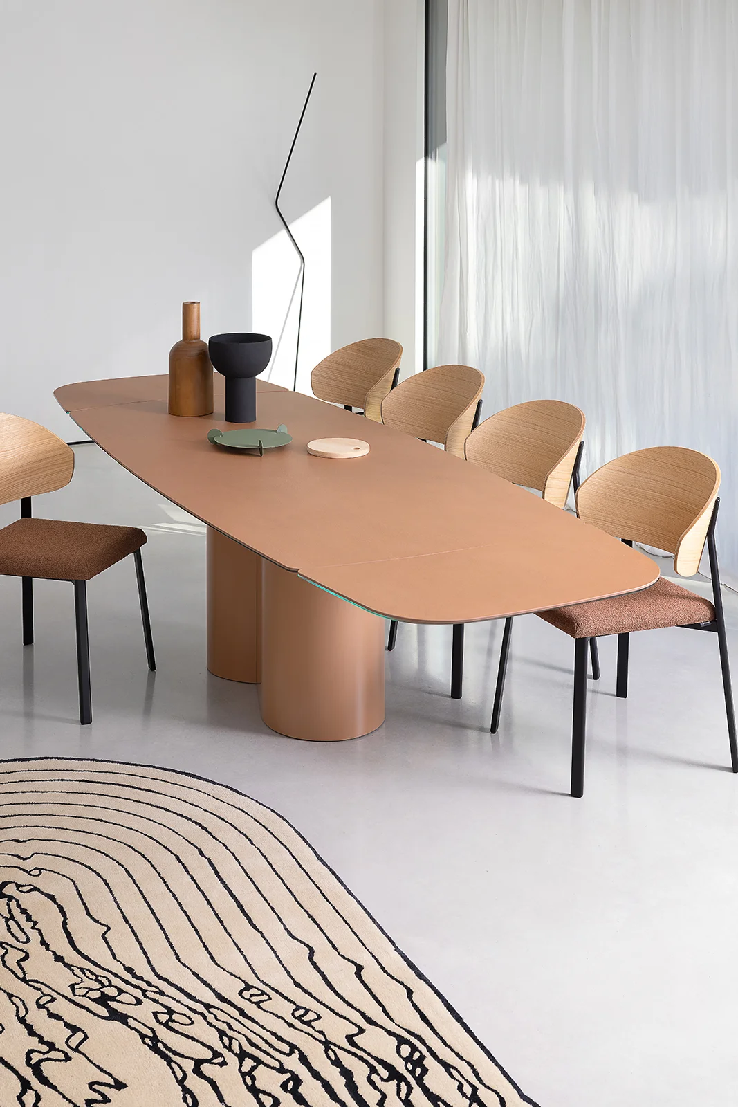 Koi is a fixed or extendable table born from the meeting of two elements that merge into a single, sculptural central base. Available in a painted, wood-veneered, or textured-effect foil finish, the base accommodates round or barrel-shaped tops in multiple materials and finishes.