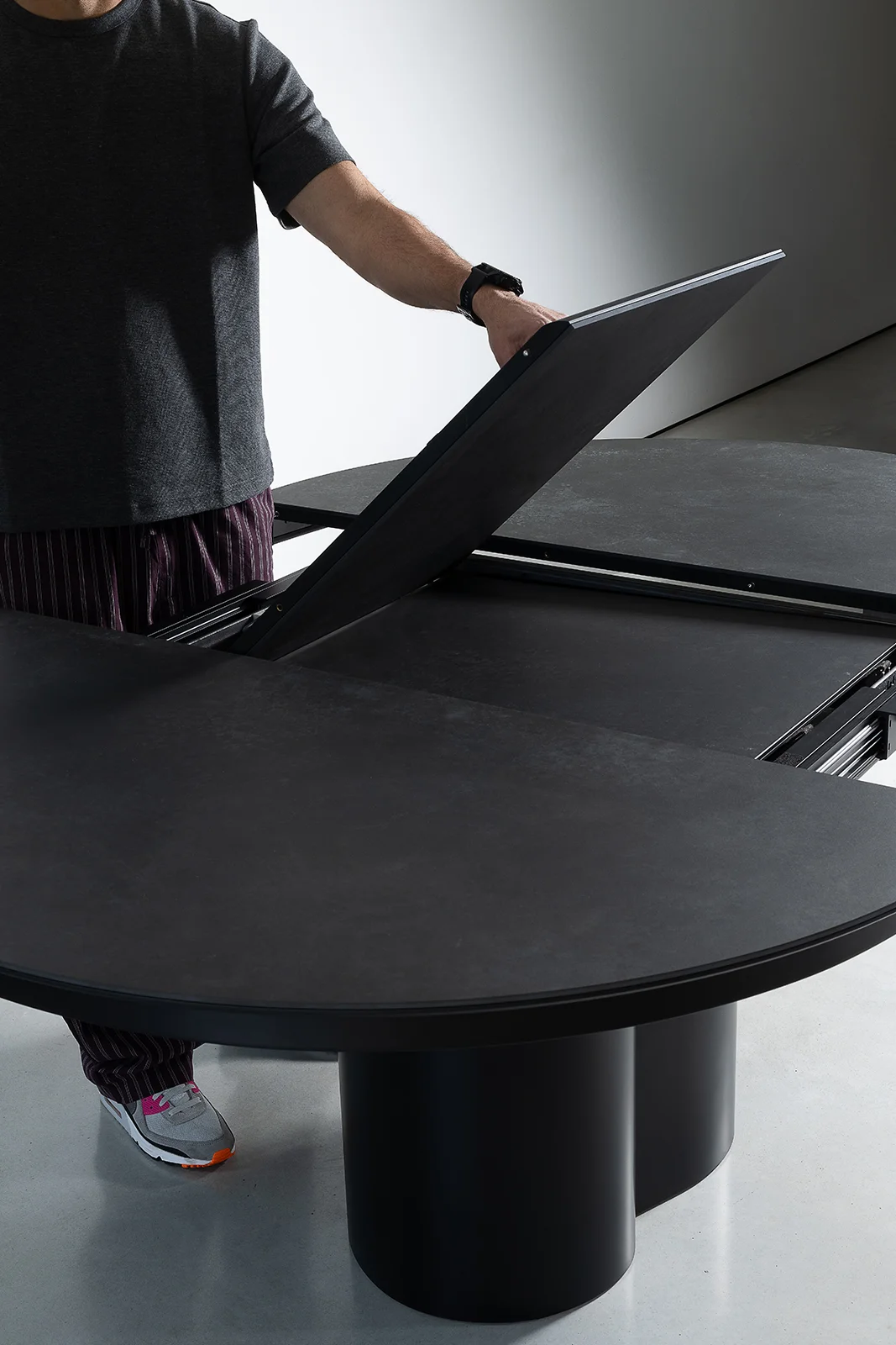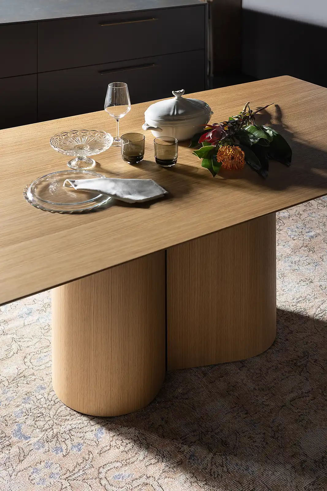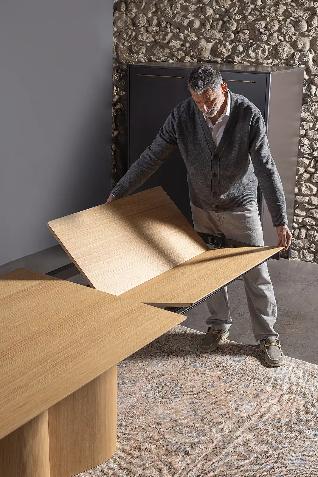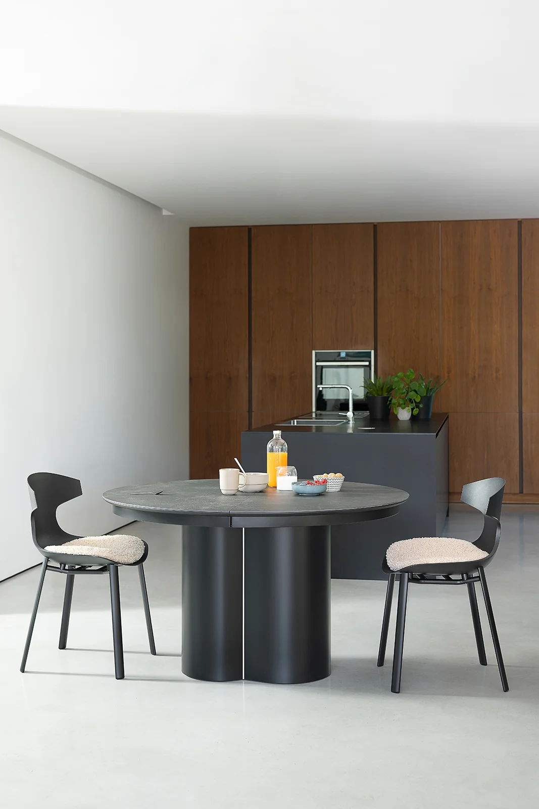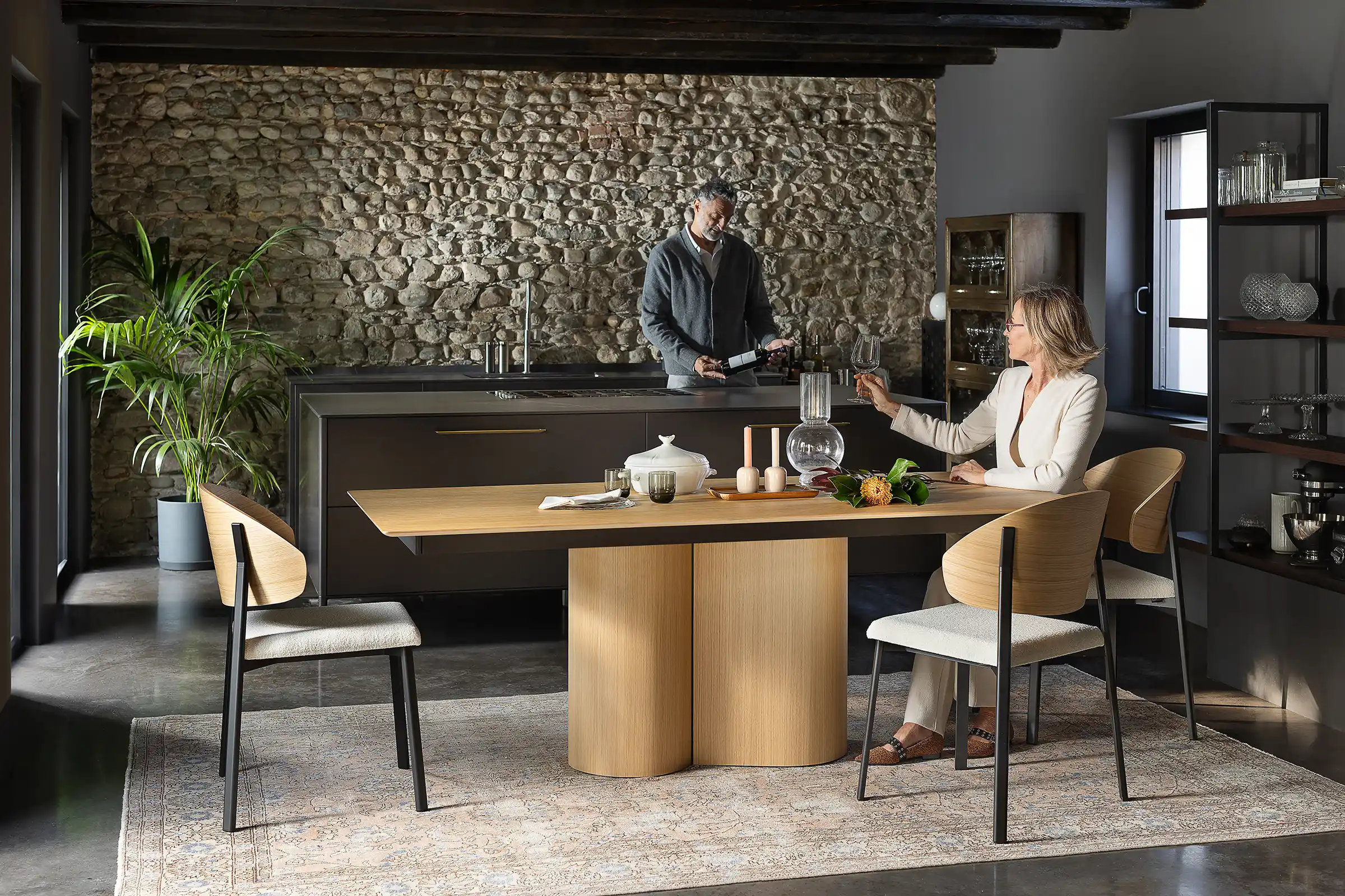 Koi is a fixed or extendable table born from the meeting of two elements that merge into a single, sculptural central base. Available in a painted, wood-veneered, or textured-effect foil finish, the base accommodates round or barrel-shaped tops in multiple materials and finishes.