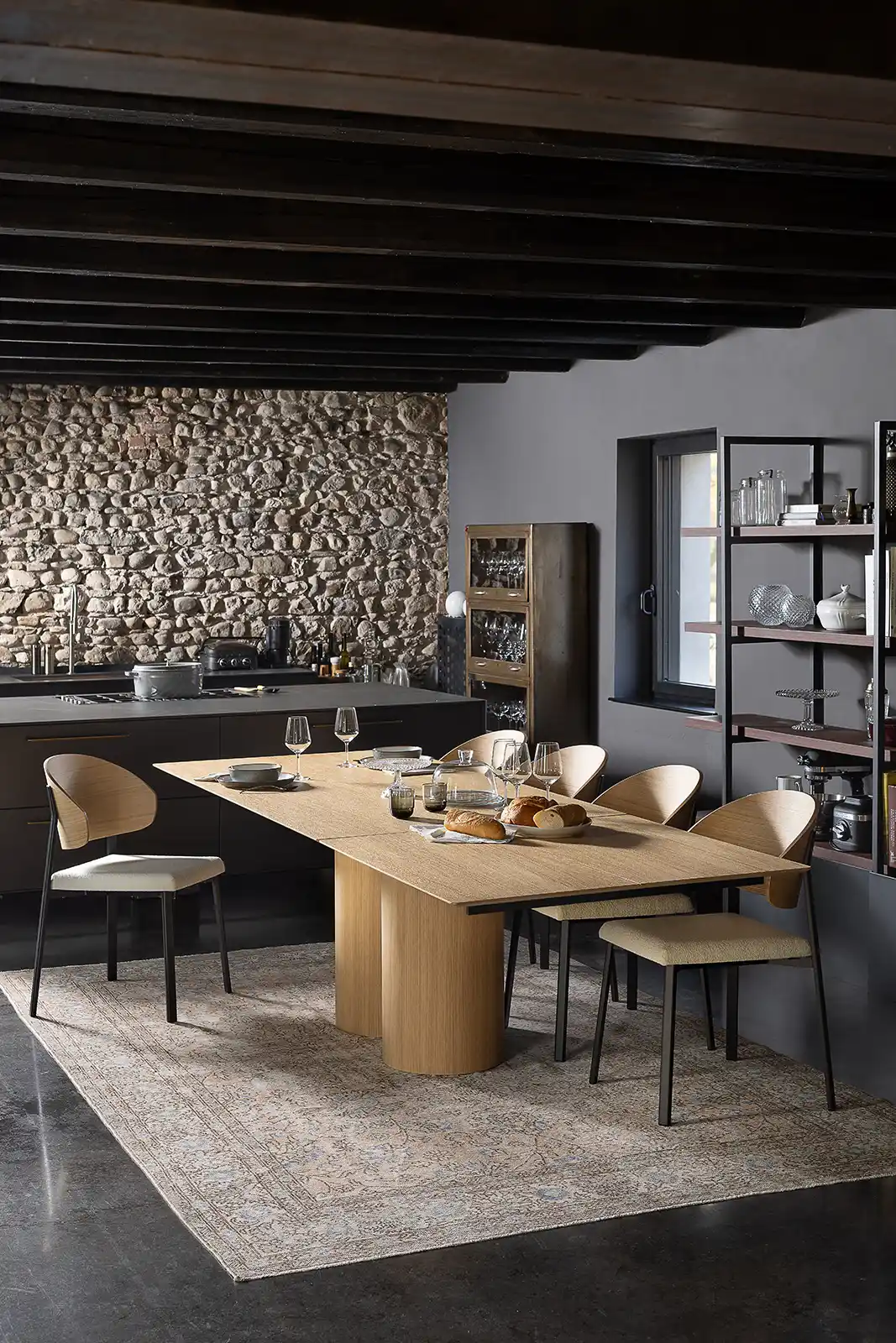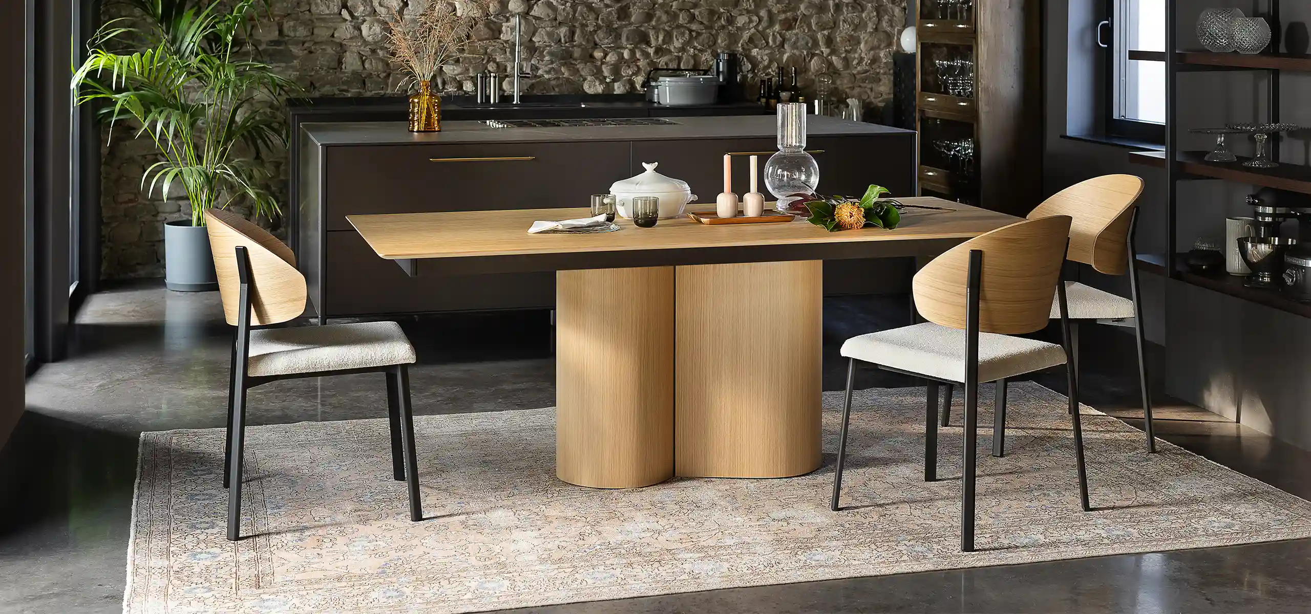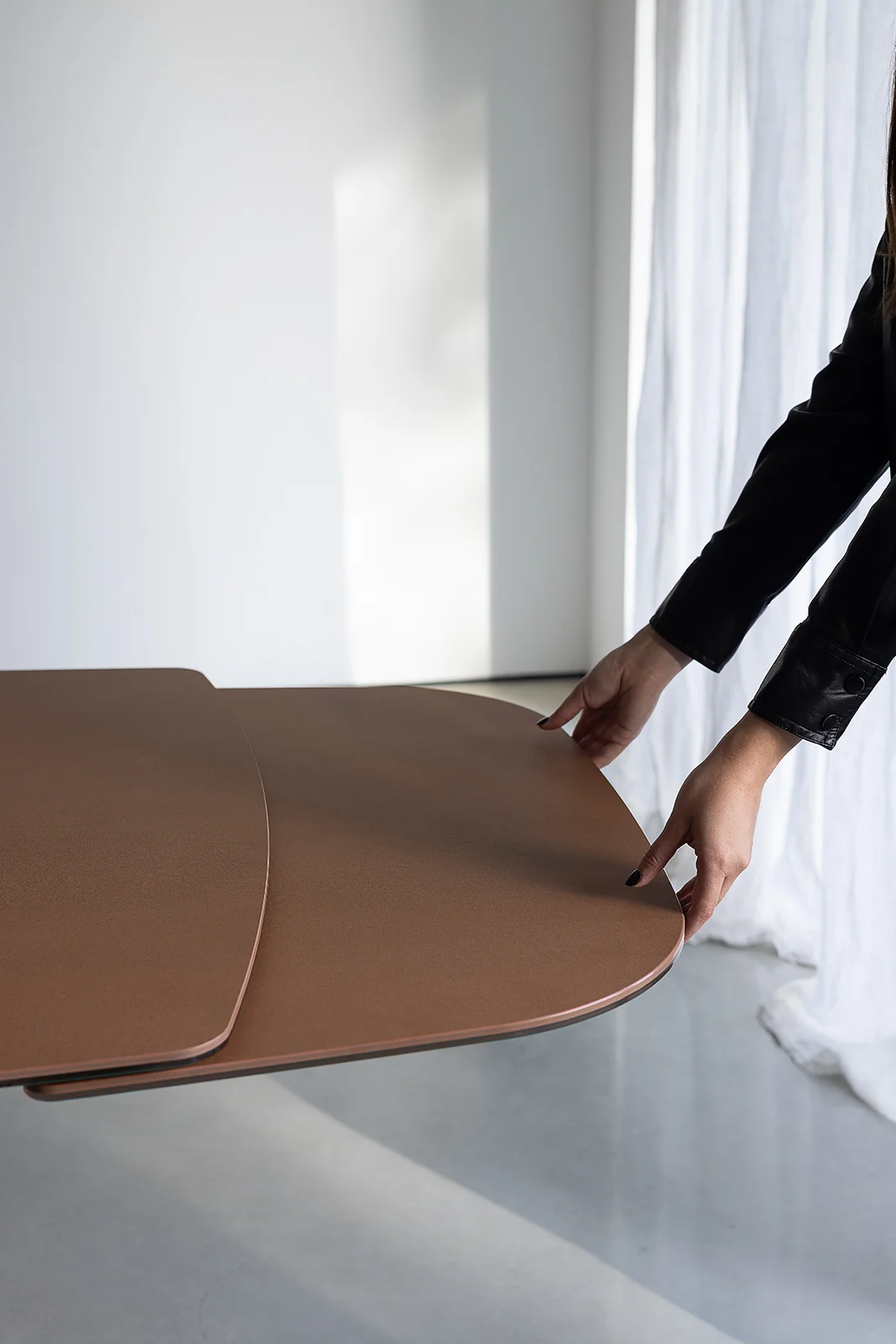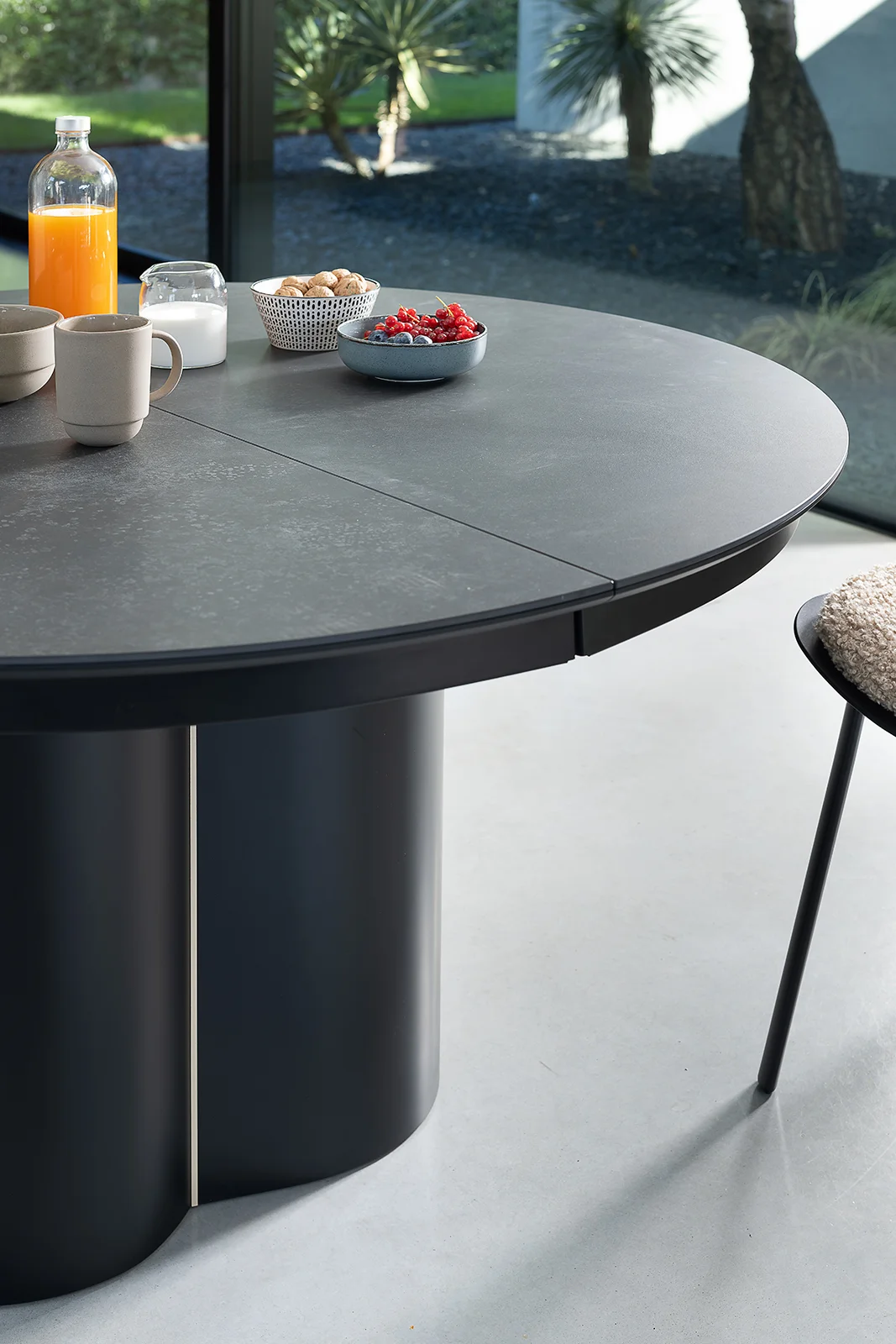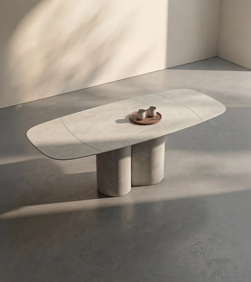 Koi is a fixed or extendable table born from the meeting of two elements that merge into a single, sculptural central base. Available in a painted, wood-veneered, or textured-effect foil finish, the base accommodates round or barrel-shaped tops in multiple materials and finishes.