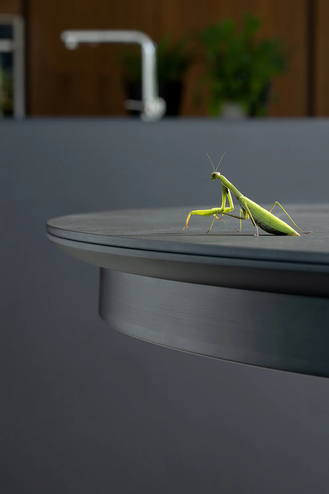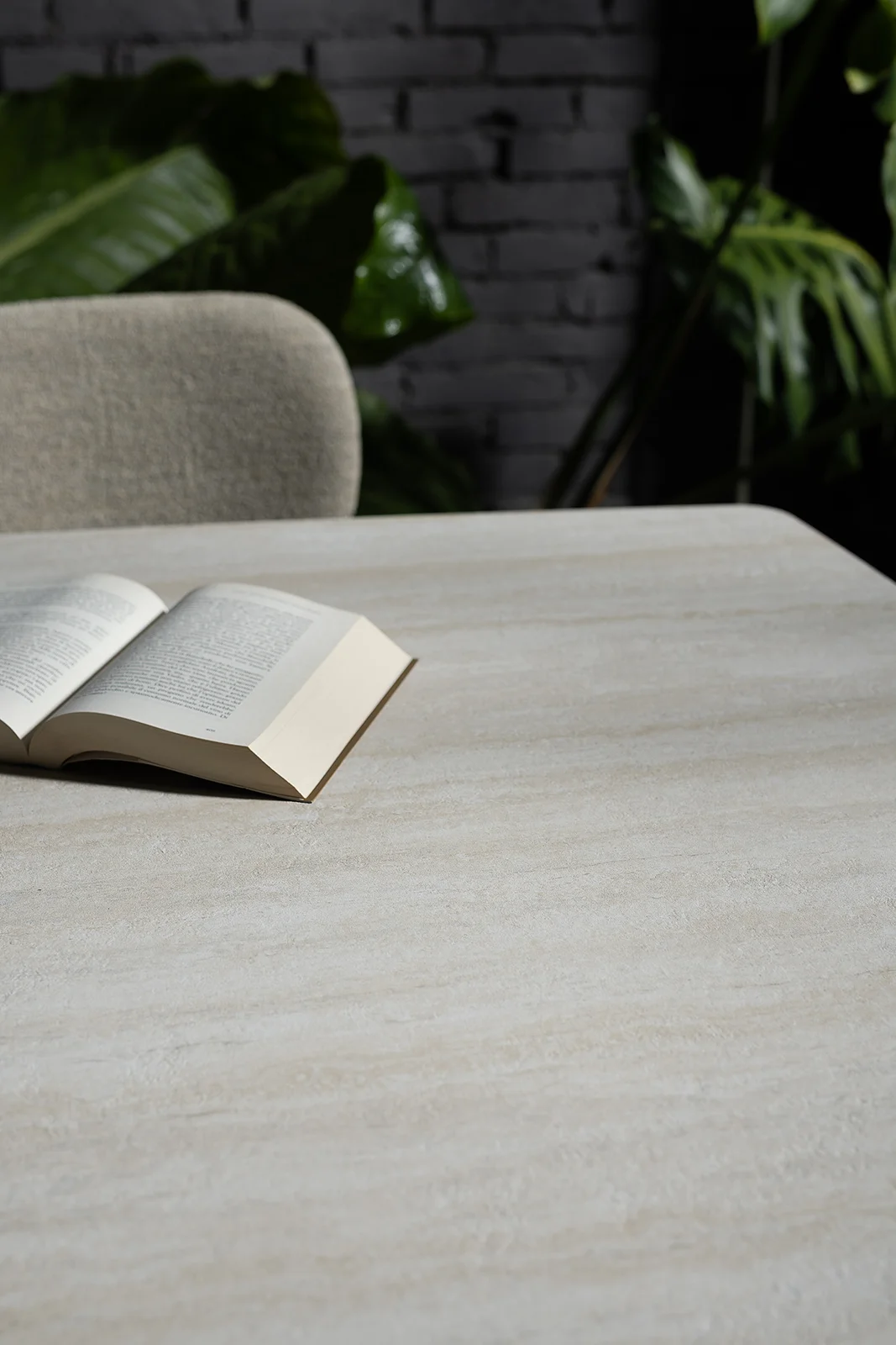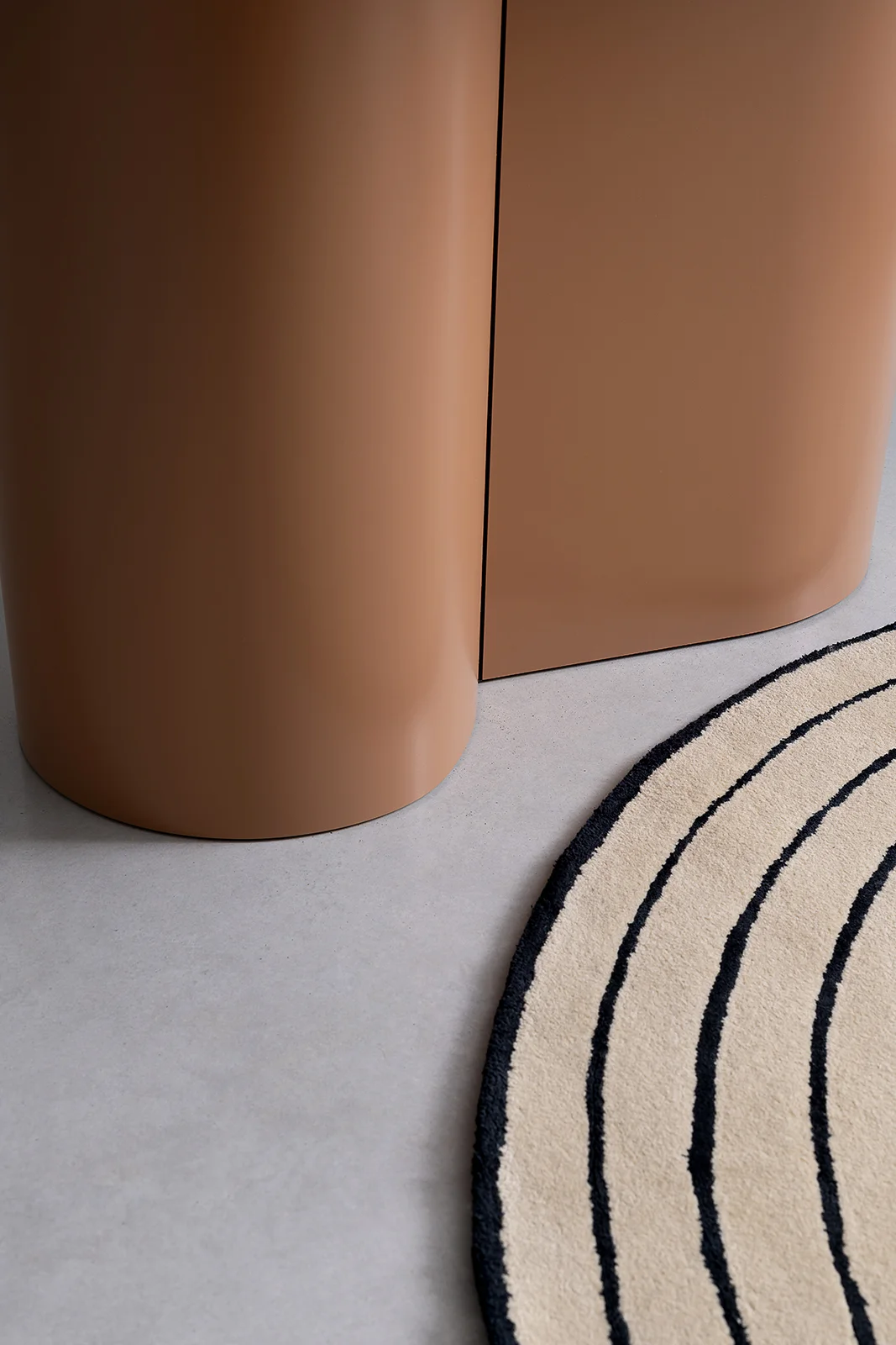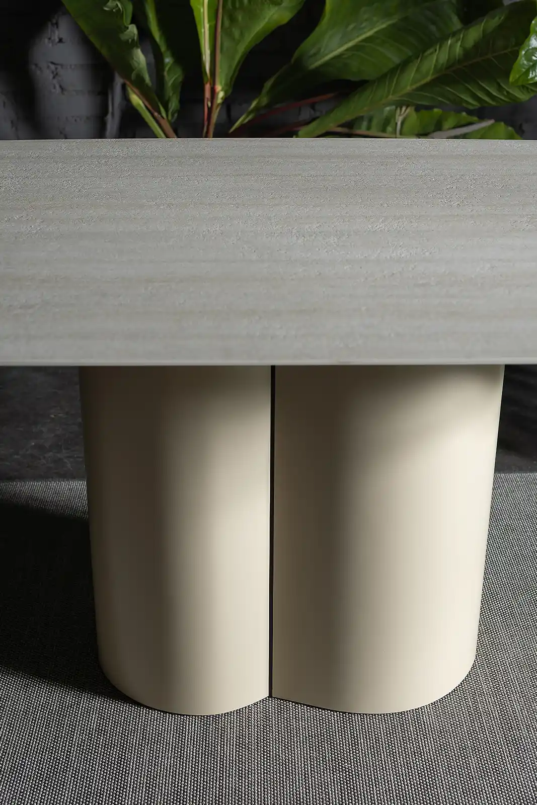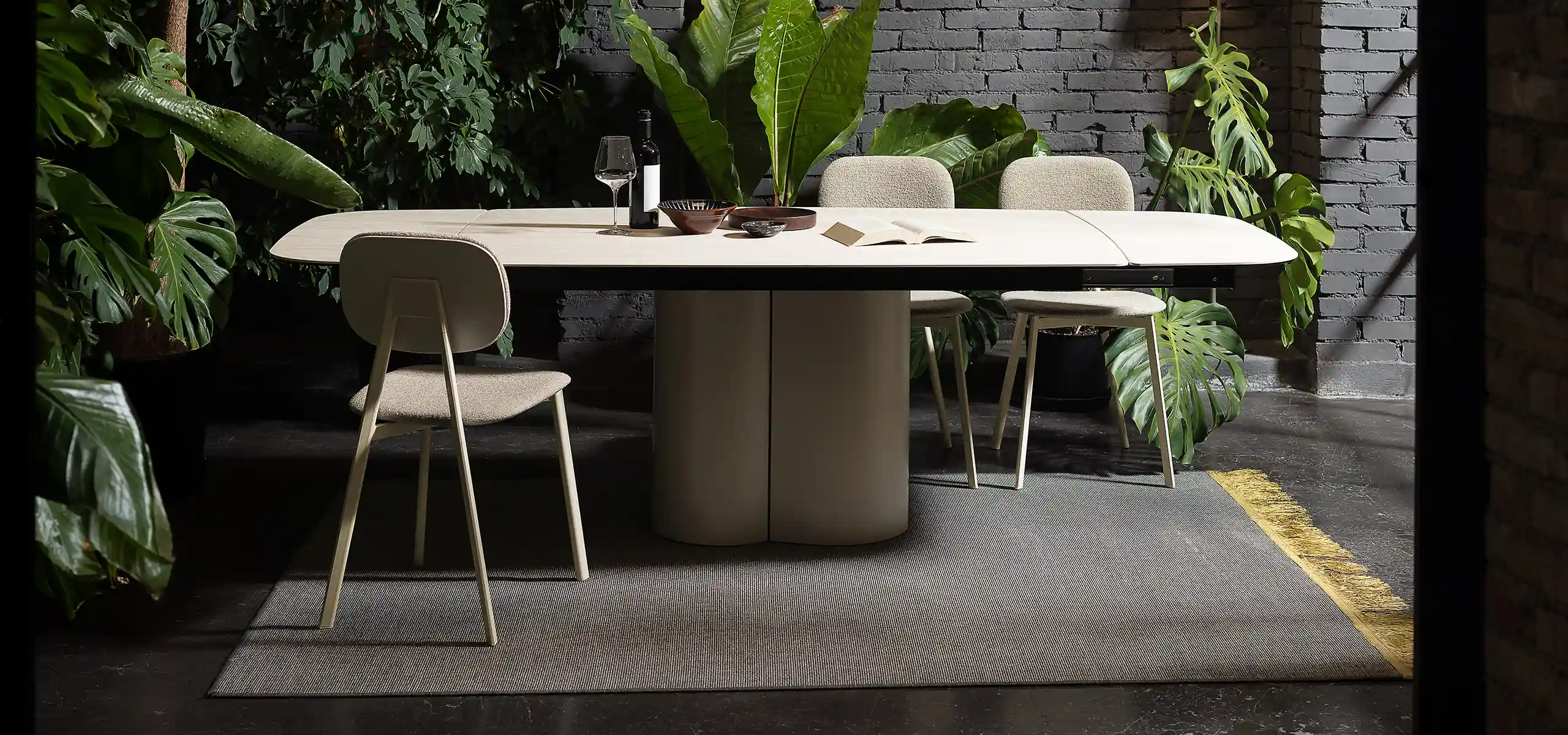 Koi is a fixed or extendable table born from the meeting of two elements that merge into a single, sculptural central base. Available in a painted, wood-veneered, or textured-effect foil finish, the base accommodates round or barrel-shaped tops in multiple materials and finishes.