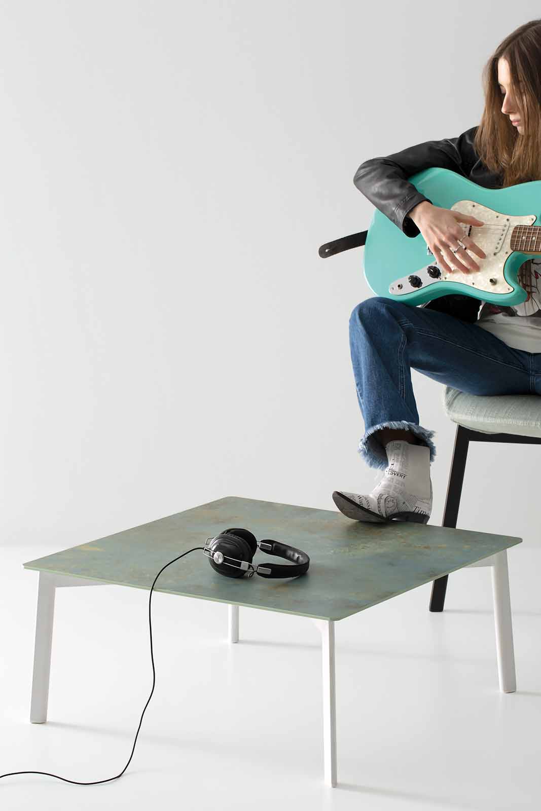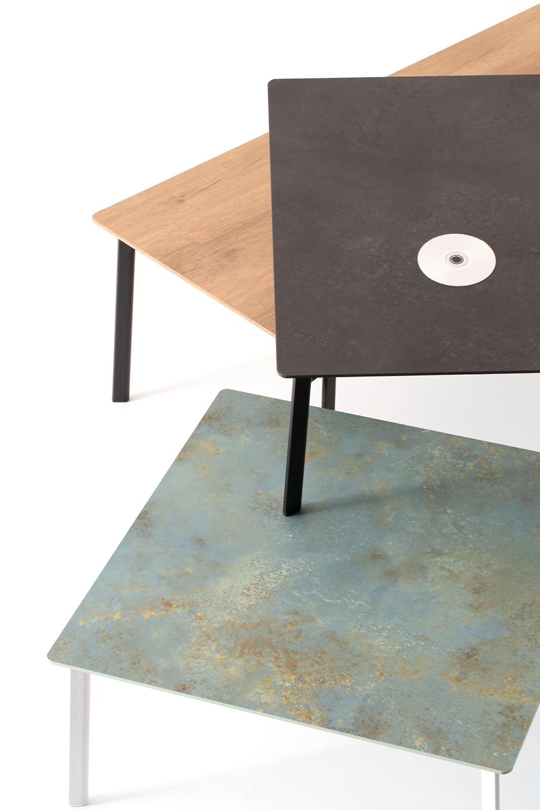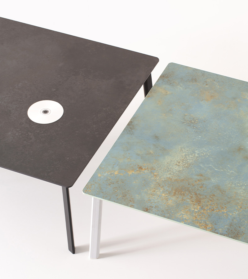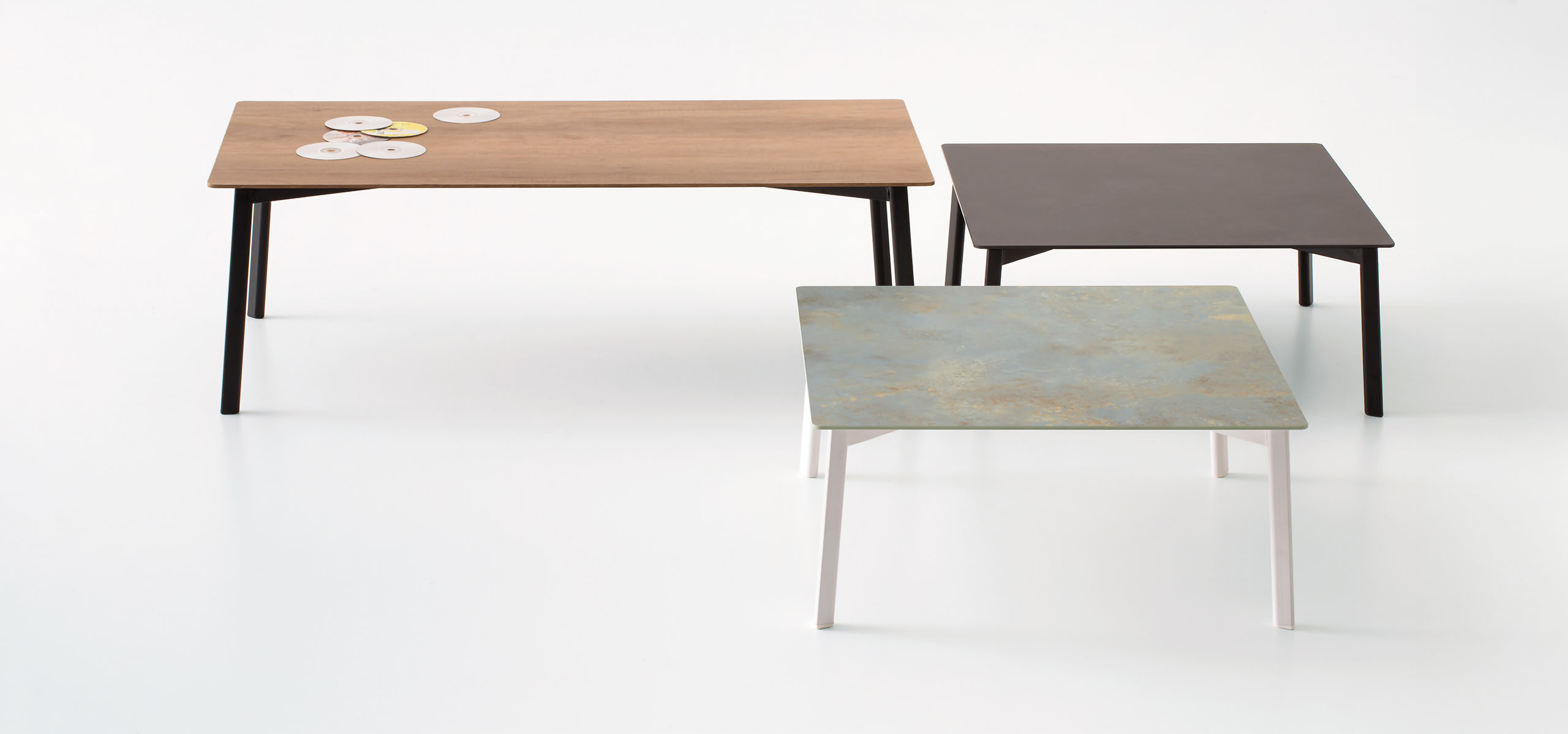 Featuring painted metal legs with a teardrop-shaped tubular section, it is available in two heights and offered with a square, rectangular or elliptical top.