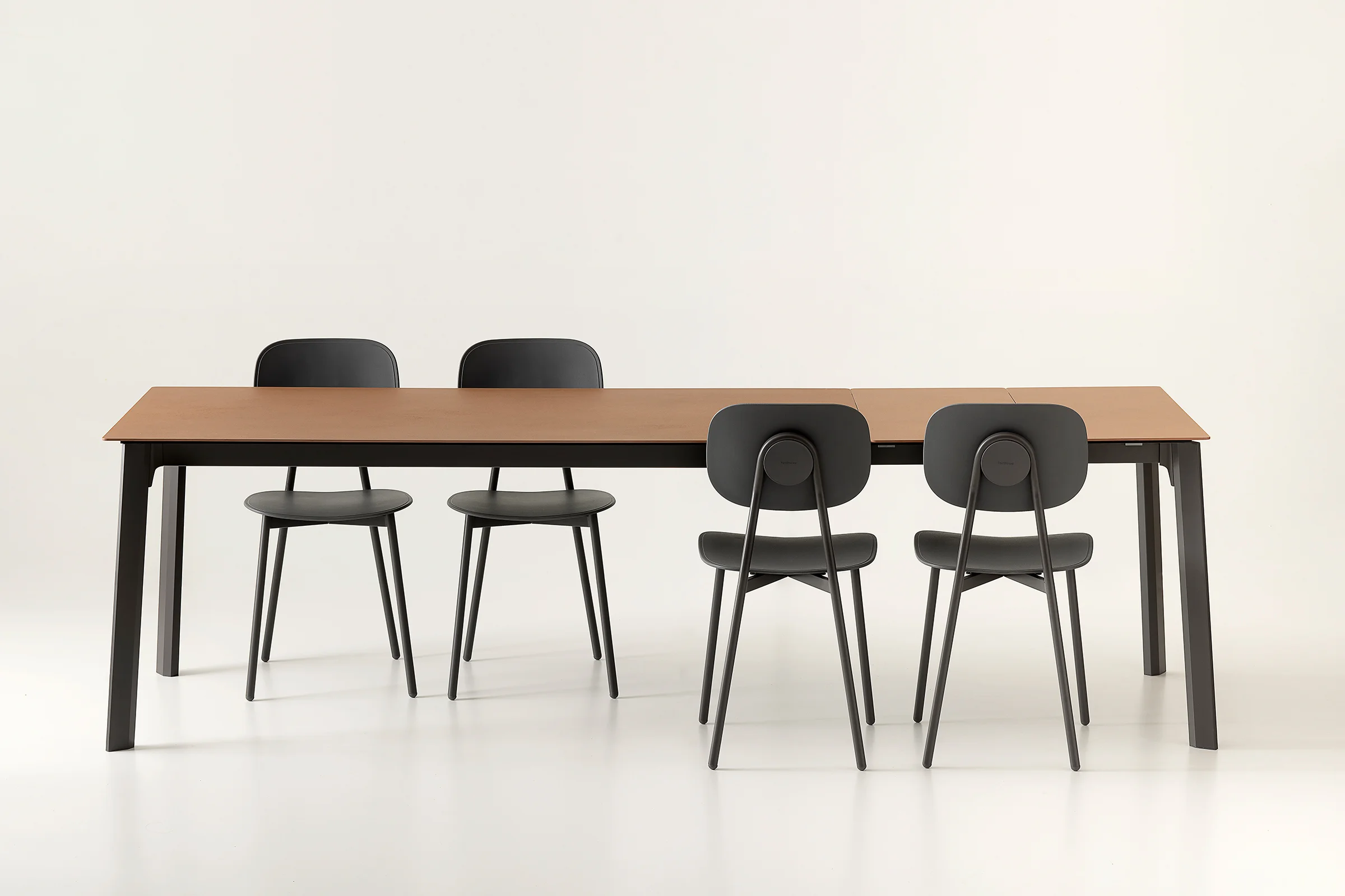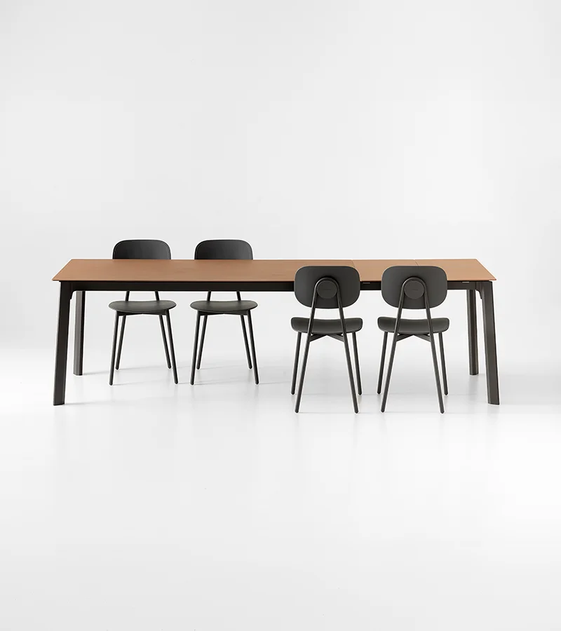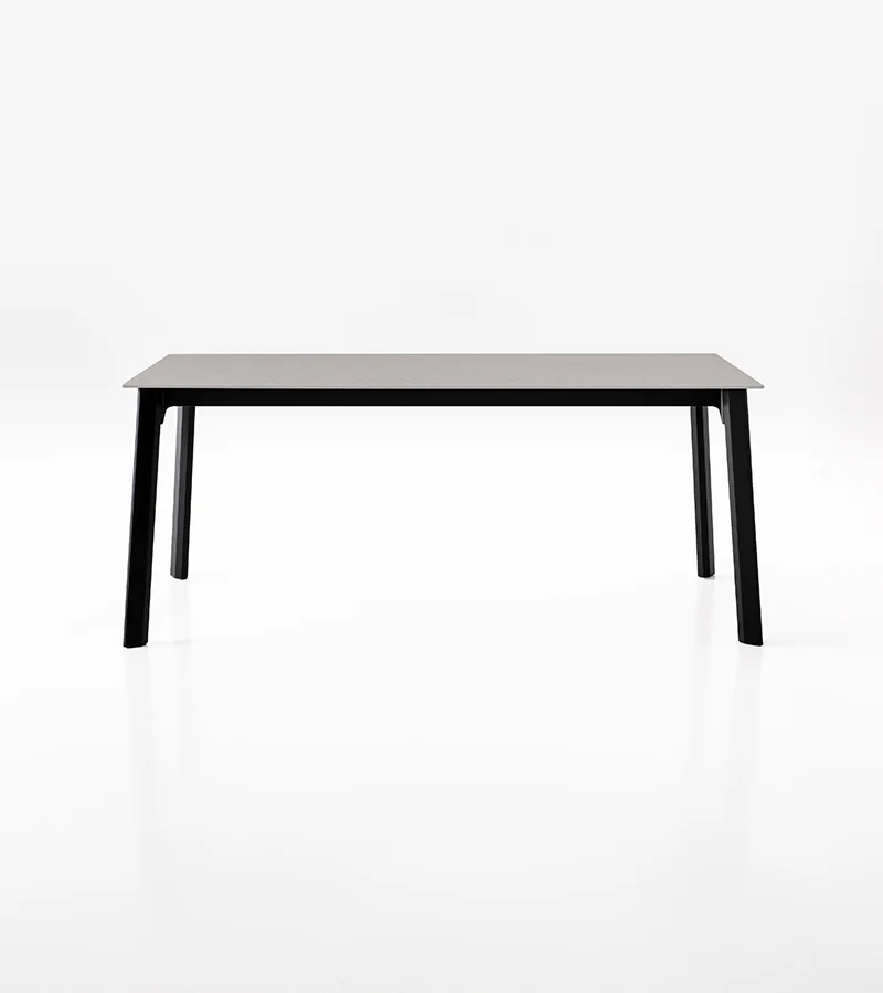 La mesa Drop se distingue por sus patas de aluminio extruido de sección poligonal en forma de gota. Disponible en versión fija o extensible, puede personalizarse con tableros de varios materiales y acabados. Es un diseño de la colección Concept.