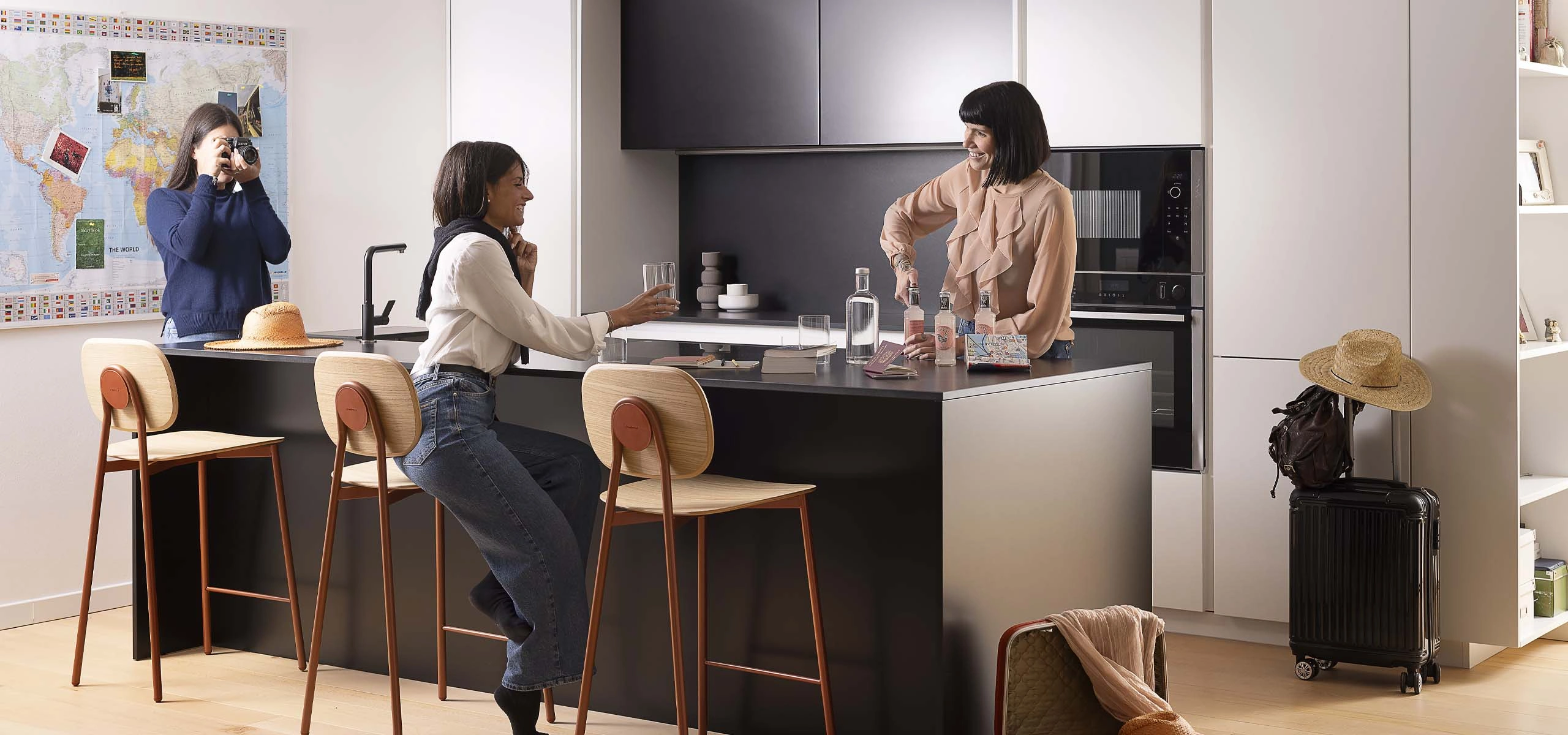 L’isola e la penisola sono il punto di ritrovo. Gli sgabelli da cucina creano una situazione informale, più rilassata, da una colazione veloce a un momento di lavoro al computer.