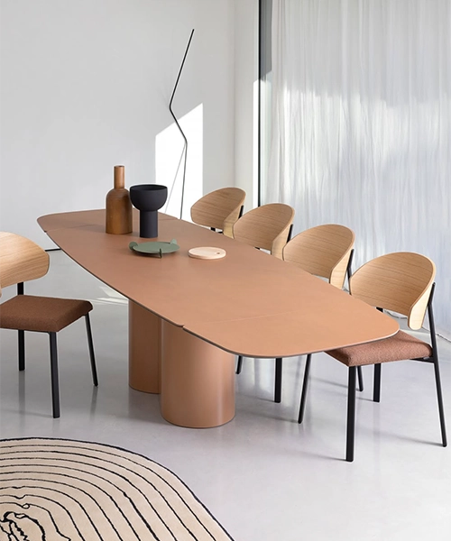 Pensato per l’area living, Koi è un tavolo che unisce equilibrio formale e versatilità, grazie a un’ampia scelta di materiali, finiture e configurazioni, anche nella versione allungabile.