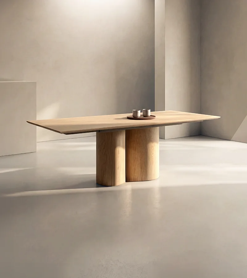 Koi è un tavolo fisso o allungabile nato dall’incontro di due elementi che si fondono in un’unica base centrale e scultorea. Disponibile nella finitura verniciata, impiallacciata legno o in lamina dall’effetto materico, la base accoglie piani tondi o a botte in molteplici materiali e finiture.